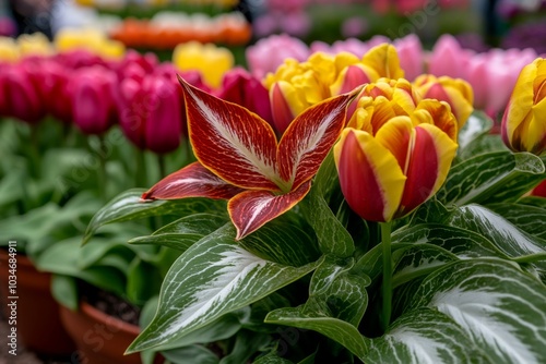 © Sanchai, Obraz premium Ajuga Reptans alongside tulips in a spring garden, creating a colorful contrast
