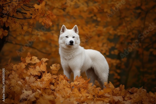 Fototapeta premium Akita in Autumn Leaves: A proud Akita standing amidst vibrant autumn leaves