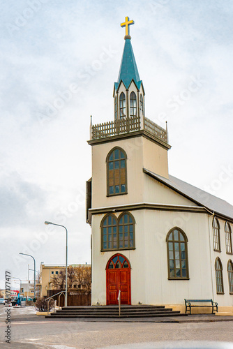 © fukez84, Obraz premium Akraneskirkja Church at Akranes town , Port town near Reykjavik around city center during winter cloudy day at Akranes , West Coast of Iceland : 15 March 2020