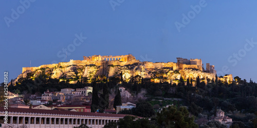 © Rawf8, Obraz premium Akropol w Atenach Grecja rock i Parthenon oświetlone, tło błękitnego nieba późnym wieczorem.