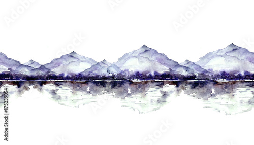 Fototapeta premium Akwarela liniowy wzór, obramowanie. niebieski, fioletowy, górski krajobraz...