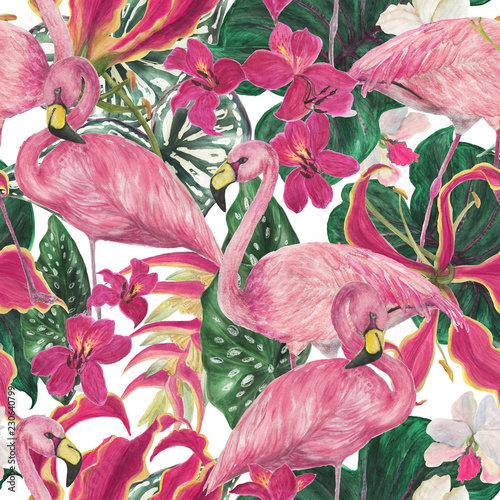 © ramiia, Naklejka premium Akwarela malarstwo wzór z flamingo ptaków i liści tropikalnych