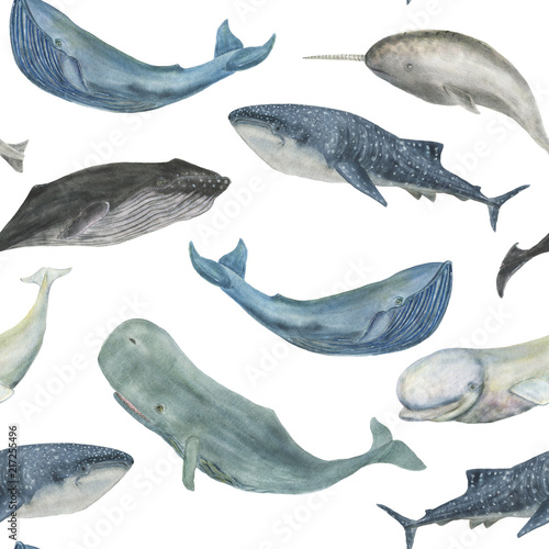 Fototapeta premium Akwarela malarstwo wzór z wielorybami