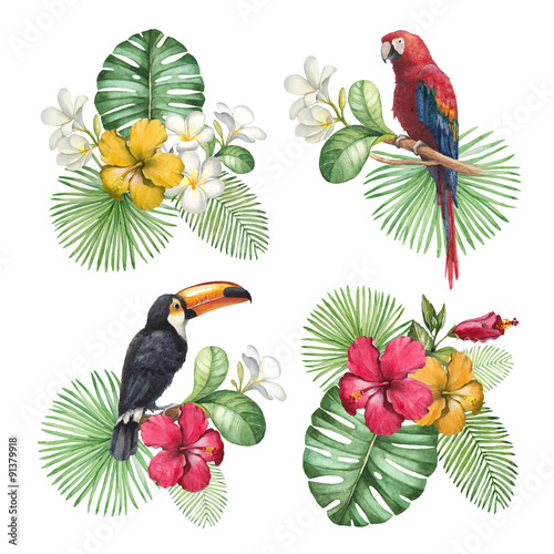 Fototapeta premium Akwarele ilustracje tropikalnych kwiatów i ptaków