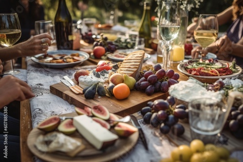 Naklejka premium al fresco picnic with family and friends, enjoying delicious food and wine,...