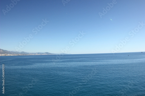 © andreswestrum, Fototapeta premium Alanya, TURKEY - August 10, 2013: Travel to Turkey. Rocks, wildlife of Turkey. Clear blue sky. The waves of the Mediterranean Sea. Water surface. Mountains and hills in the distance in the background.
