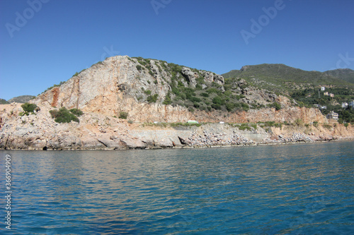 © andreswestrum, Fototapeta premium Alanya, TURKEY - August 10, 2013: Travel to Turkey. The waves of the Mediterranean Sea. Water surface. Mountains and hills on the coast of Turkey. Green hills. Port.