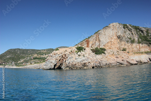 © andreswestrum, Fototapeta premium Alanya, TURKEY - August 10, 2013: Travel to Turkey. The waves of the Mediterranean Sea. Water surface. Mountains and hills on the coast of Turkey. Green hills. Port.