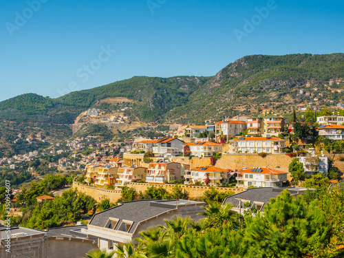 Obraz premium Alanya, Turkey. Beautiful view new houses on the mountain. Real estate. Vacation postcard background