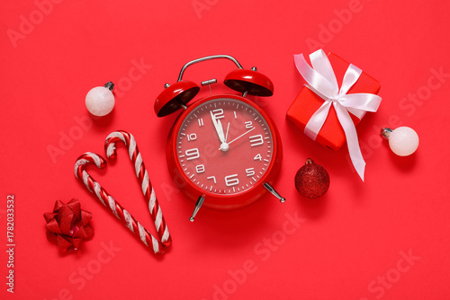 Naklejka premium Alarm clock with Christmas decorations and gift box on red background