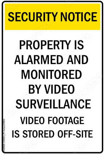 Fototapeta premium Alarm warning sign property is alarmed and monitored by video surveillance. Video footage is stored off site