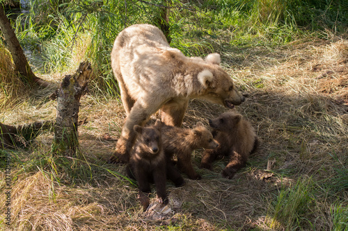 Fototapeta premium Alaskan brown bear sow with three cubs