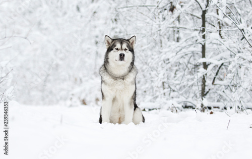 Naklejka premium Alaskan Malamute dog on a winter walk in the snow
