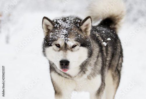 Naklejka premium Alaskan Malamute dog on a winter walk in the snow