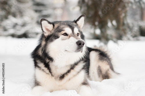 Naklejka premium alaskan malamute lying in snow. Dog winter.