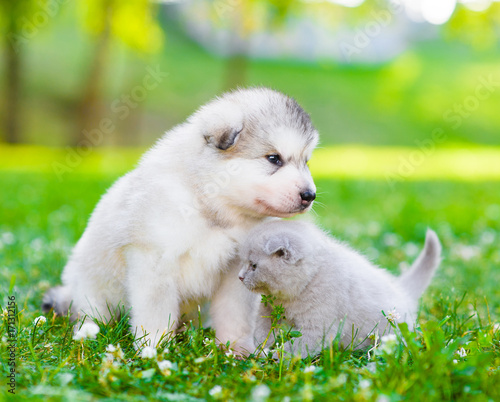 © Ermolaev Alexandr, Fototapeta premium Alaskan malamute puppy and kitten sitting together on green grass