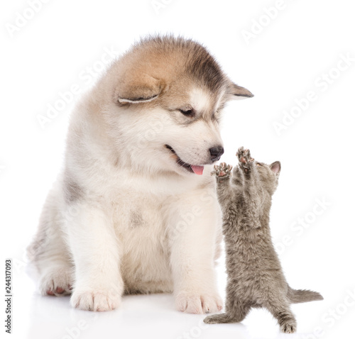 Obraz premium Alaskan malamute puppy with playful kitten. isolated on white background