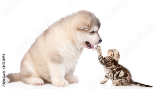 Obraz premium Alaskan malamute puppy with playful tabby kitten. isolated on white background