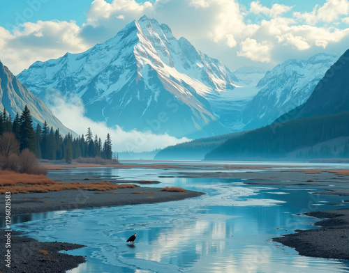 © Aleksandr, Obraz premium Alaskan salmon river estuary. Low tide reveals braided channels while a bald eagle perches in the distance, surveying the landscape