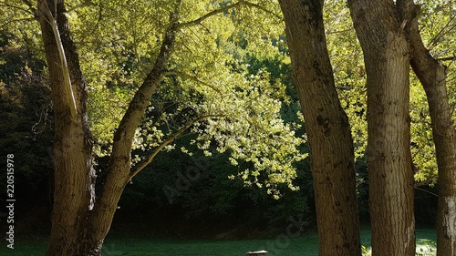 © Donoval, Fototapeta premium Alberi illuminati con Parco e fiume Esanatoglia, Italy