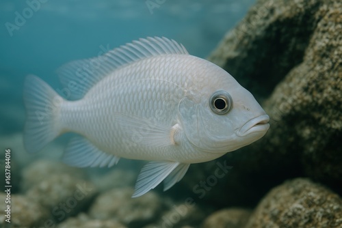 © Generative AI, Fototapeta premium Albino Cichlid Fish Swimming Underwater Near Rocks, Portrait of a Freshwater Aquatic Animal