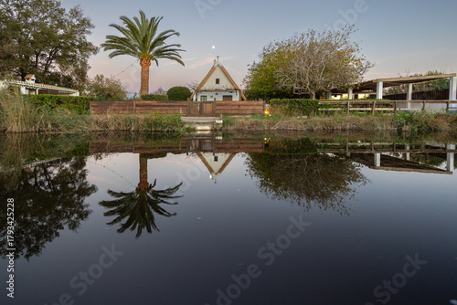 © Azulblue, Obraz premium Albufera lake reflecting traditional house and palm tree