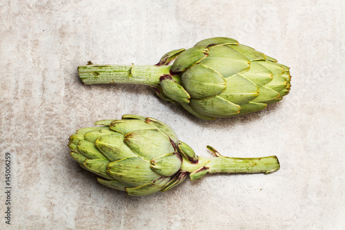Obraz premium Alcachofas entera sobre mesa gris. Vista superior