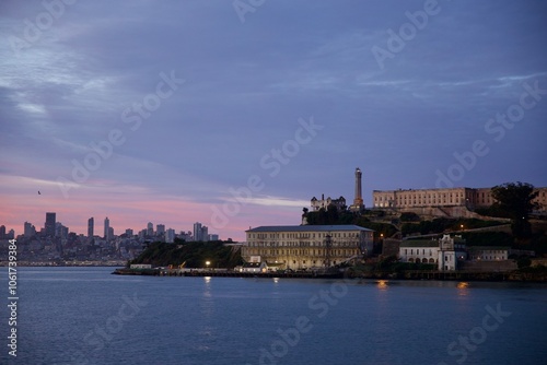 Naklejka premium Alcatraz island prison back lit in the sunrise