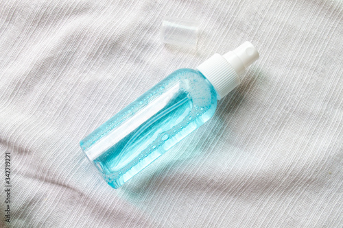 Naklejka premium Alcohol spray bottle on a white fabric background