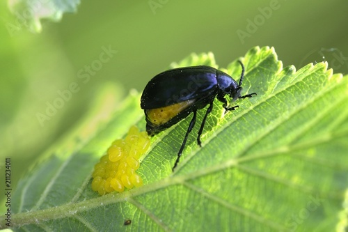 Fototapeta premium Alder leaf beetle, Agelastica alni, laying eggs