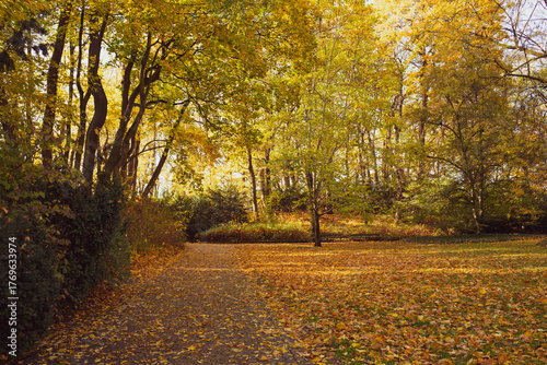 Naklejka premium Aleja parkowa w jesiennej, złotej odsłonie