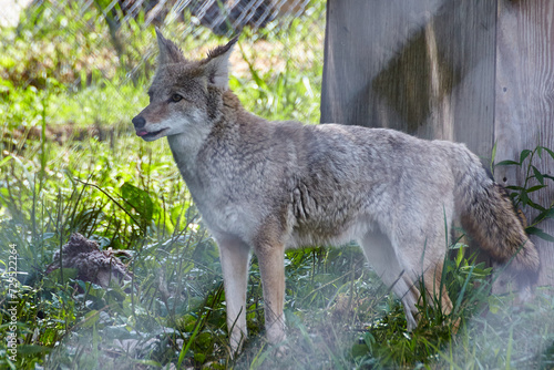 © Nicholas J. Klein, Fototapeta premium Alert Coyote in Sanctuary, Profile View with Fences