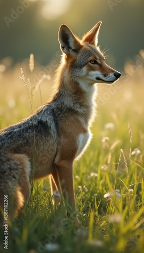 Naklejka premium Alert Coyote Standing in a Meadow at Sunset, Observing its Surroundings with an Intense Gaze