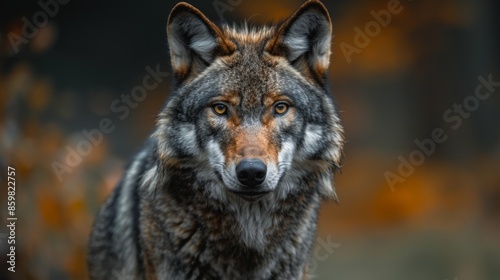 © Adi, Fototapeta premium Alert Eurasian wolf, canis lupus, facing camera in summer forest from front view with copy space