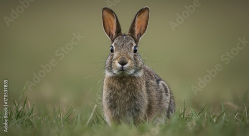 © Ilham Mo, Fototapeta premium Alert European Hare in Meadow Stares Intently at Camera.