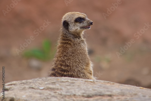 Fototapeta premium Alert meerkat hiding behind a rock whilst on guard and watching for predators.
