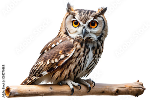 © HIRA STOCK, Fototapeta premium Alert owl perched on a branch, isolated on white background