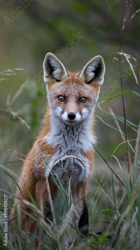 © Kiss, Fototapeta premium Alert Red Fox Gazing Through Tall Grass in Natural Green Wilderness Setting