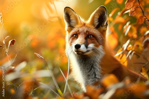 © Divyesh, Fototapeta premium Alert red fox in the wild with a warm, golden autumnal background, Generative AI