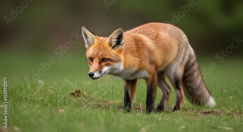 Fototapeta premium Alert Red Fox Stalking Prey in Lush Green Meadow, Focused Gaze