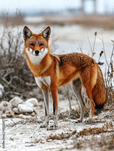 © Dece Std, Obraz premium Alert red fox stands on beach, soft neutral background, looking at the camera