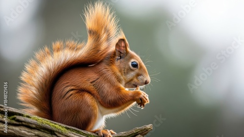 © Nimra, Obraz premium Alert red squirrel perched on tree branch in forest