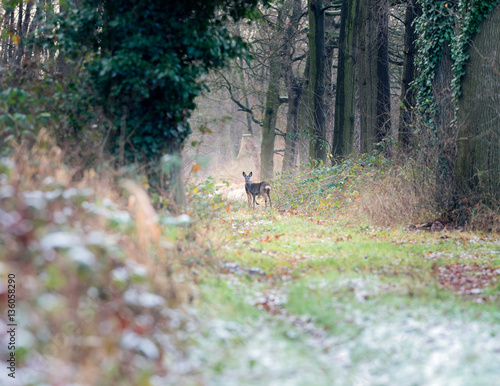 © ysbrandcosijn, Fototapeta premium Alert roe deer standing on path in winter forest.