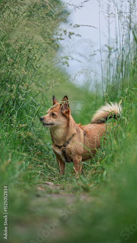 © Denis, Naklejka premium Alert small brown dog with a fluffy tail standing in tall green grass, wearing a harness, looking attentively into the distance. Natural outdoor setting, summer, nature walk.