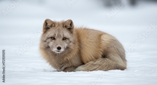 Naklejka premium Alert Tan Fox Sitting Calmly in Snowy Winter Landscape