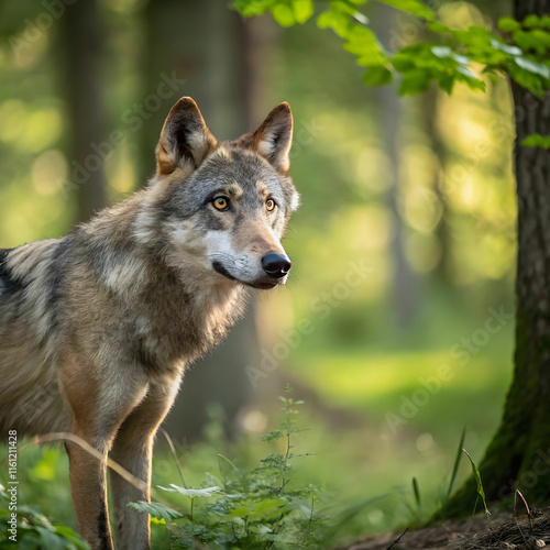 © munawar, Fototapeta premium alert wolf facing camera in summer forest
