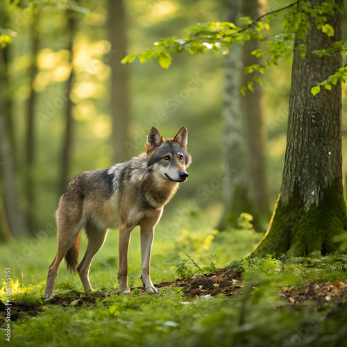 © Husnat, Obraz premium alert wolf facing camera in summer forest