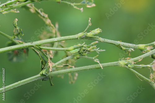 © Tomasz, Naklejka premium Alfalfa plant damaged by larvae of Lucerne weevil - Hypera postica. It is a dangerous pest of this crop plant.