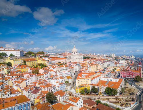 Fototapeta premium Alfama district and National Pantheon also called Santa Engracia Church, in Lisbon, Portugal. Aerial drone view
