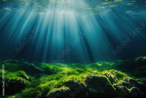 Obraz premium Algae-covered seabed with sunlight filtering through.